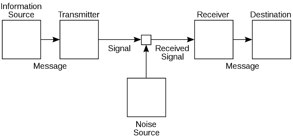 Although ‘entropy’ has been notoriously hard to define since its first framing by Carnot in 1824, it has since appeared both in the context of information theory and the physics of thermodynamics – but both speak of different things.[3] Informational ‘entropy’ is a concept first developed by Norbert Wiener and Claude Shannon, most notably in Shannon’s work “A Mathematical Theory of Communication,” where he posits it as a relationship between the ‘information’ and ‘redundancy’ tied to the “chance” of an element of communication occurring at a given time and in a given place within the message.[4] In his classical schema of a “general communication system,”[5] (img. 1) Shannon describes a signal as a discrete packet which can be transmitted from source to destination with some intervening noise potentially scrambling the messages’ coherence, decreasing its structuration and increasing its “entropy.”